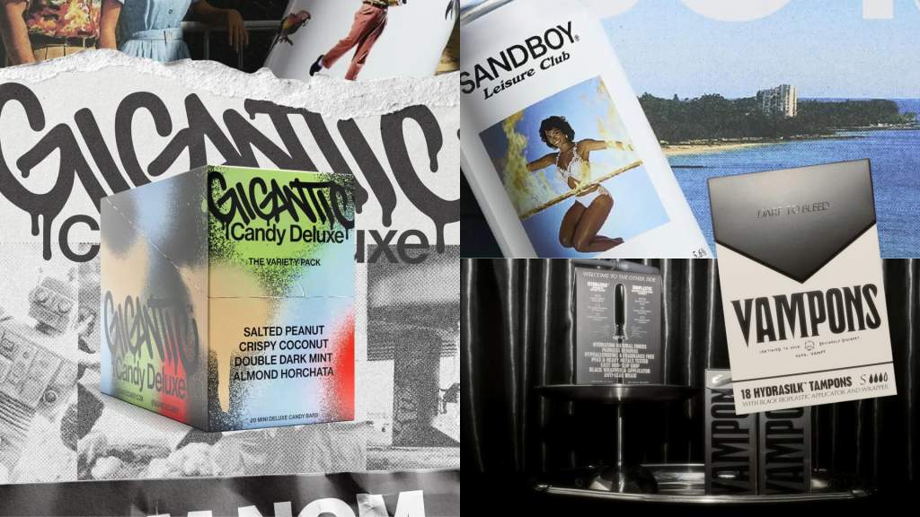 You see it in projects like the Gigantic rebrand, where everything, from the graffiti typography to the cigarette-inspired packaging, all leans into the name. The shift was dramatic, flipping the brand’s former identity on its head and rebuilding it with an entirely new visual language. Vampons is a tampon brand so literal in its vampire-coded aesthetic that the packaging becomes almost a parody of itself. Then there’s Sandboy’s leisure drink that leans so fully into its lazy-day, sun-drenched identity. These brands are world-building, yes, but they also have a campy appeal.